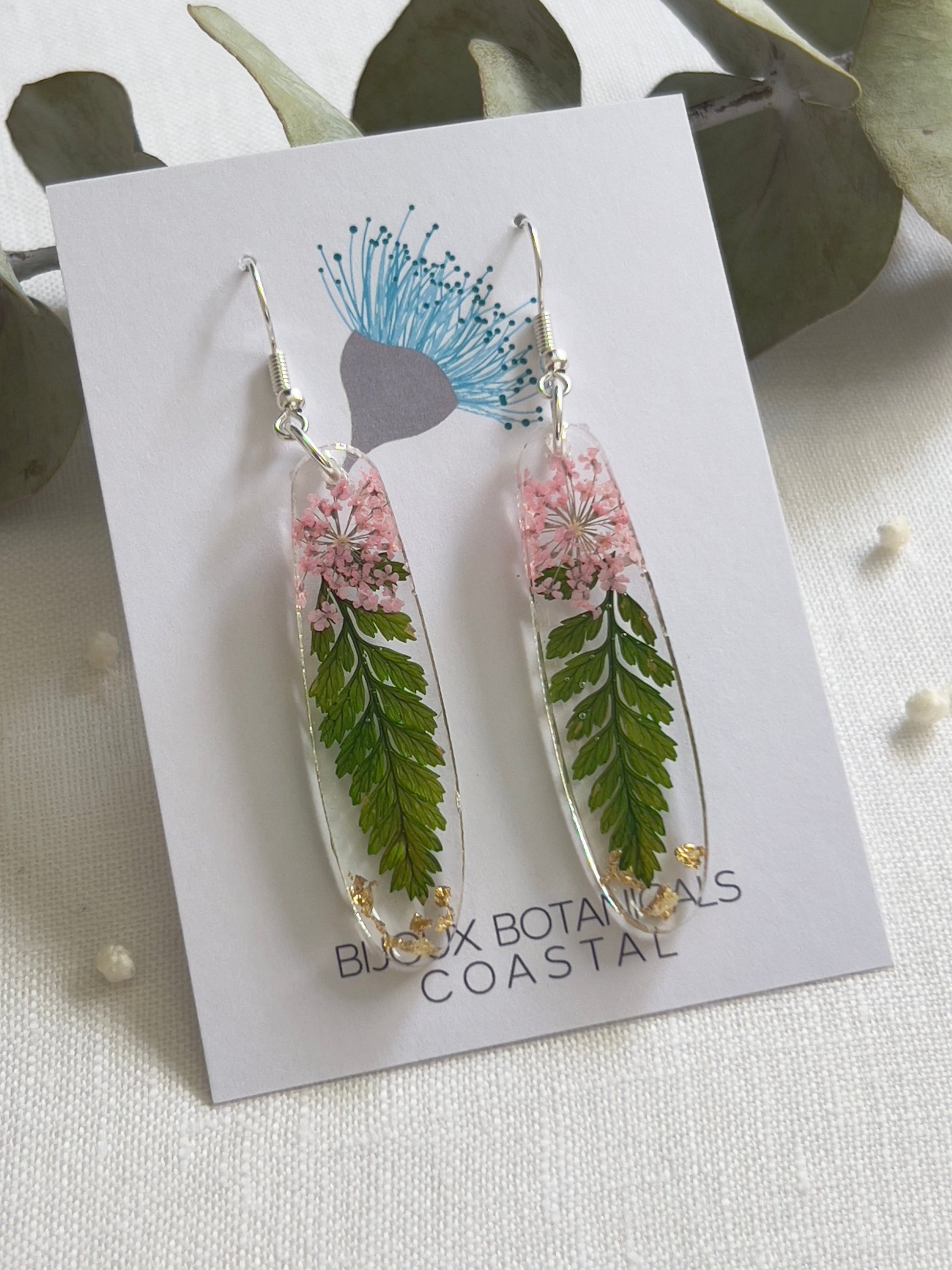 Delicate fern leaf with Queen Anne's lace blossom on a clear background with silver fittings.