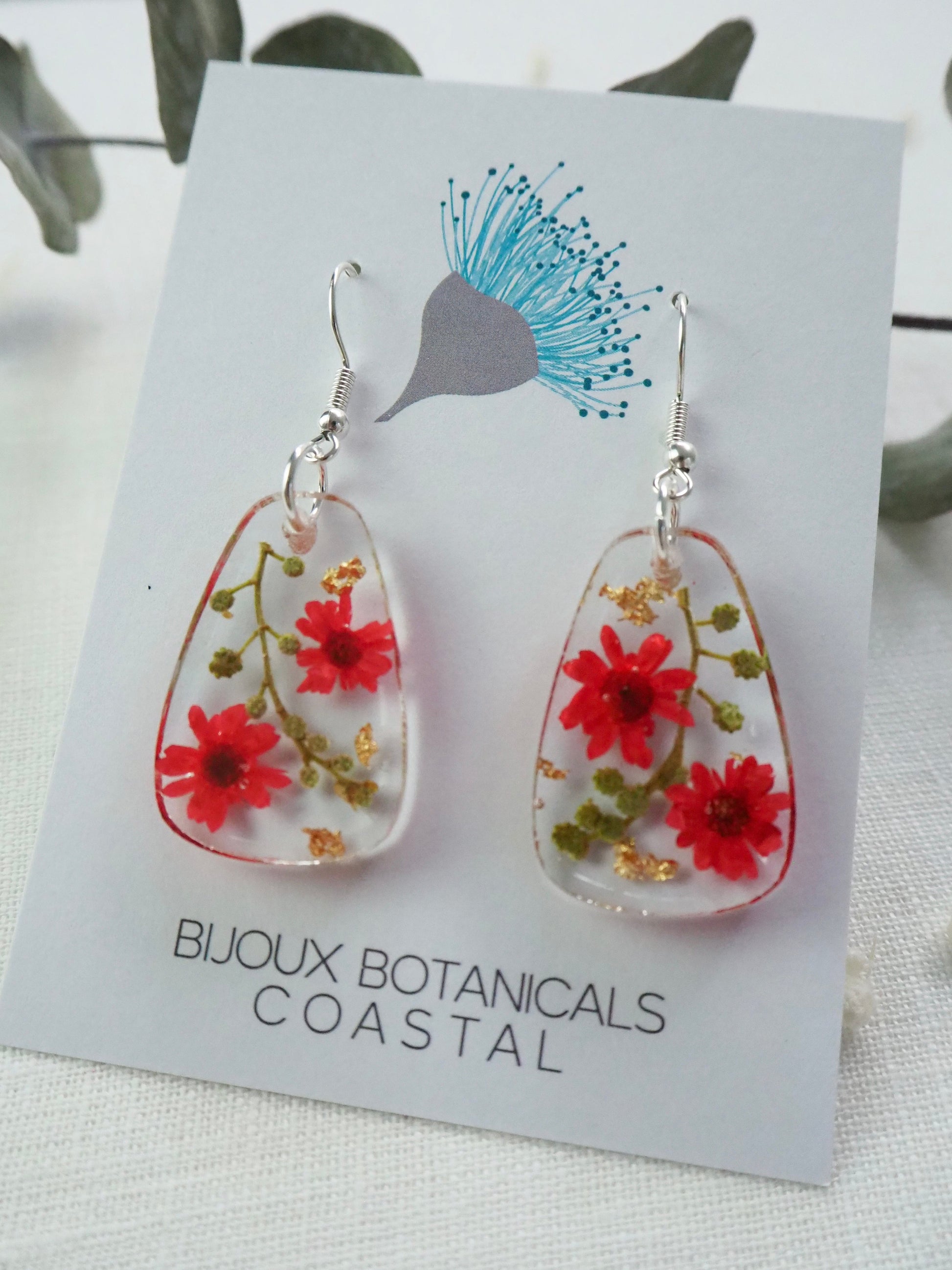 Sweet red blossoms and wattle buds on a clear background with silver fittings.